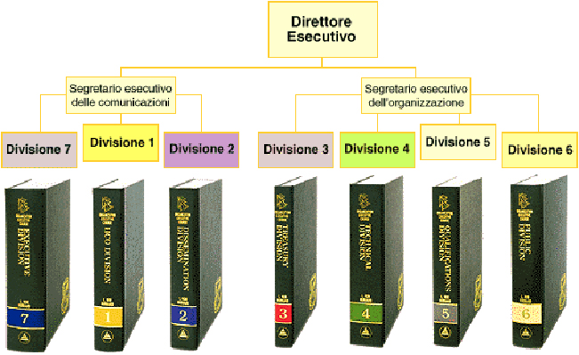 L’organigramma sviluppato da L. Ron Hubbard contiene sette divisioni, ognuna delle quali svolge delle funzioni e dei doveri ben precisi. Tutta la tecnologia amministrativa di L. Ron Hubbard è contenuta negli otto volumi che costituiscono il Corso per Executive dell’Organizzazione. Il Volume 0 (qui a sinistra), testo basilare per la formazione del personale, contiene tutte le direttive relative ad ogni membro del personale di un’organizzazione. Gli altri sette volumi, da 1 a 7, corrispondono alle divisioni dell’organigramma che riportano gli stessi numeri. Ogni volume divisionale contiene tutte le direttive pertinenti allo scopo e alle funzioni di quella divisione.